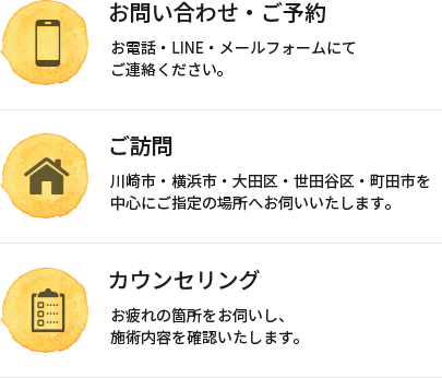 当店での施術は、15年以上のキャリアを持つ整体師が担当いたします。 腰の痛みや肩のこりはもちろん、手足のしびれや生理痛など、不調の原因が定かではないものも、お客様といっしょに軽減・回復へと近づけてきました。 営業時間はAM8:00~翌2:00。お仕事終わりや家事の合間など、都合に合わせてご予約できます。出張タイプなので店舗に通って待たされるようなわずらわしさはございません。