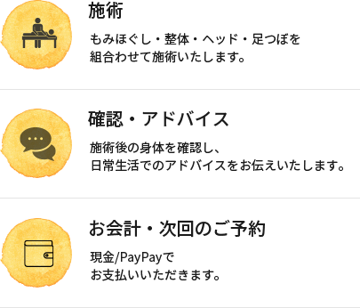 当店では60分・90分・120分のコースをご用意。その時間内で、もみほぐし以外にも整体、ヘッド、足つぼも行えます。 肩のこりといった不調には継続した施術が必要ですが、日によってやって欲しいことは異なるもの。その日の身体のコンディション・気分に合わせて、もみほぐしなどの組合せをご提案いたします。